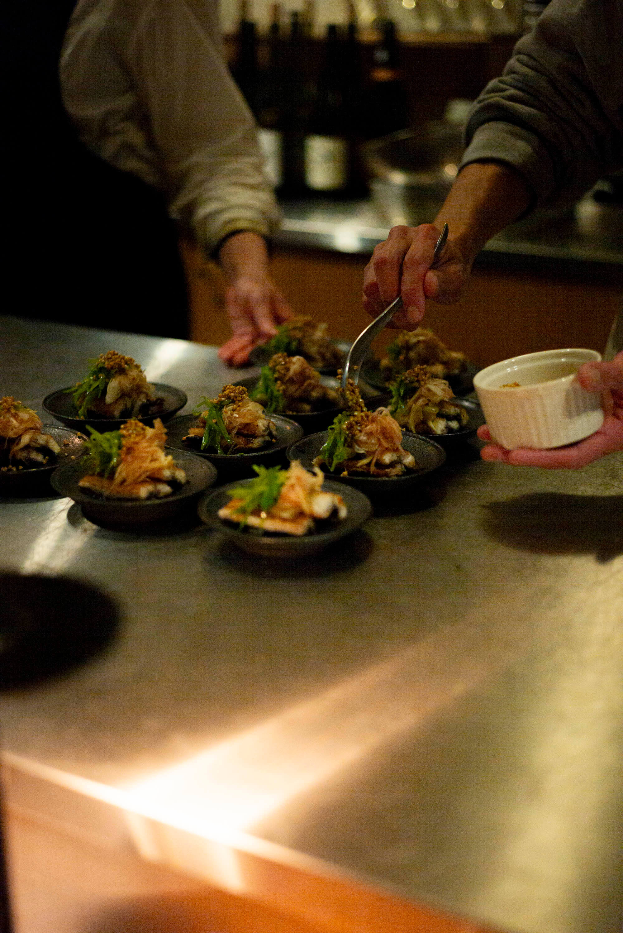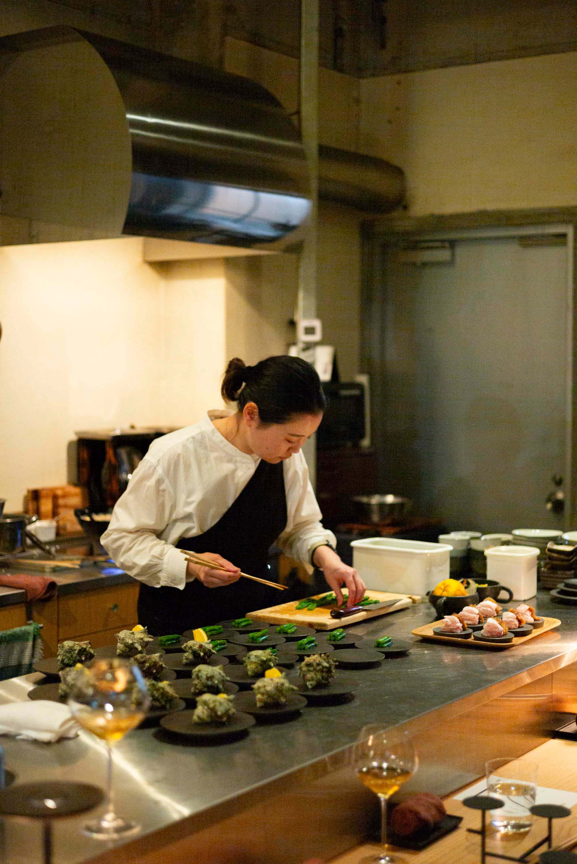 弊社が企画・運営するMONギャラリーで、2月22日(土)〜3月23日(日)まで開催されているNEW KARATSU-プロダクトデザイナー寺内ユミによるMISHINAと唐津の作家10名展。その最初の3日間、MONギャラリーに併設するMONワインバーにて、特別なフードイベントが行われました。料理を手がけたのは、唐津の名店「たまとり」の伊藤真衣さん。佐賀・唐津の新鮮な食材を使ったオリジナルコースが、MISHINAや展示作家さんの器に盛り付けられました。