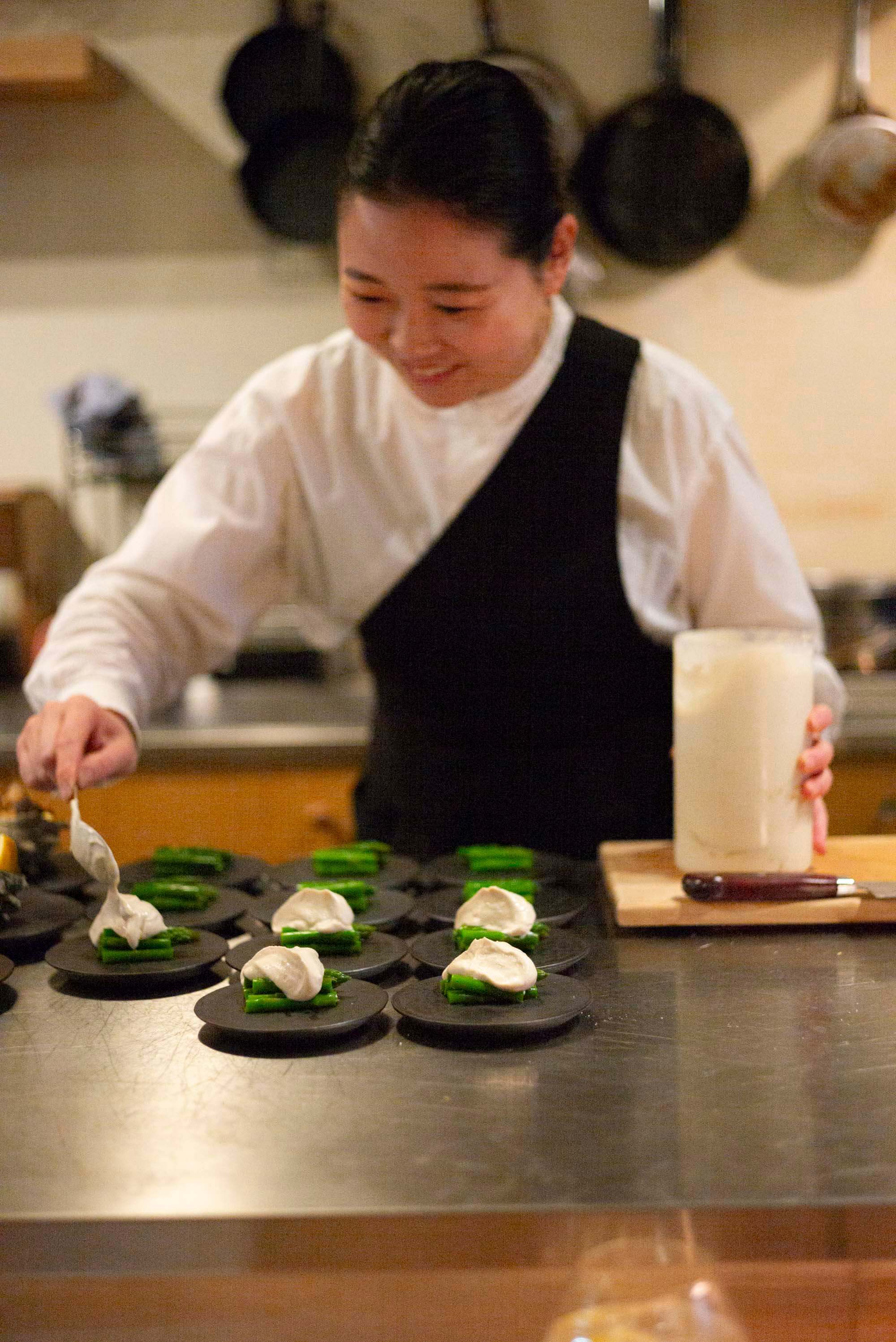 上|螺 銀杏 木耳(器:吉永サダム)・右|アスパラガス 白和(器:明質亘史)・左|平目 菊芋(器:吉永サダム)