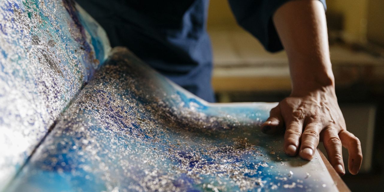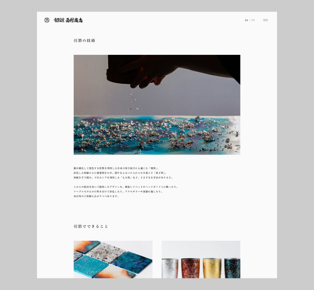 余白を生かしたミニマルなレイアウトを採用し、工房で作業を行っている場面の写真をふんだんに用いることで、新しい素材としての引箔の魅力が一目で伝わるようにしました。