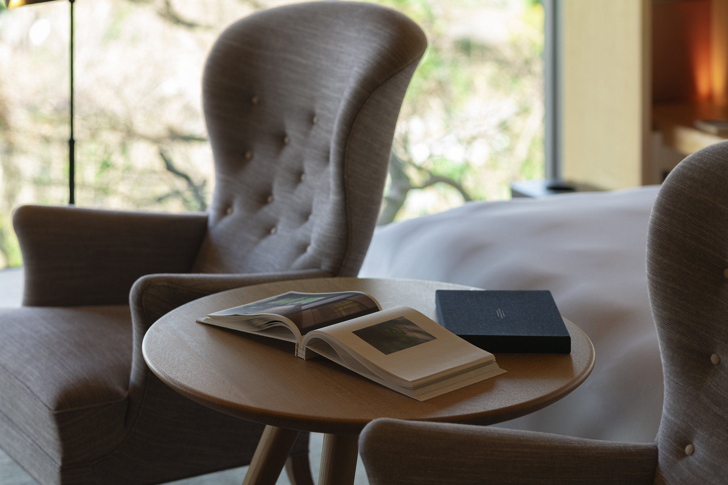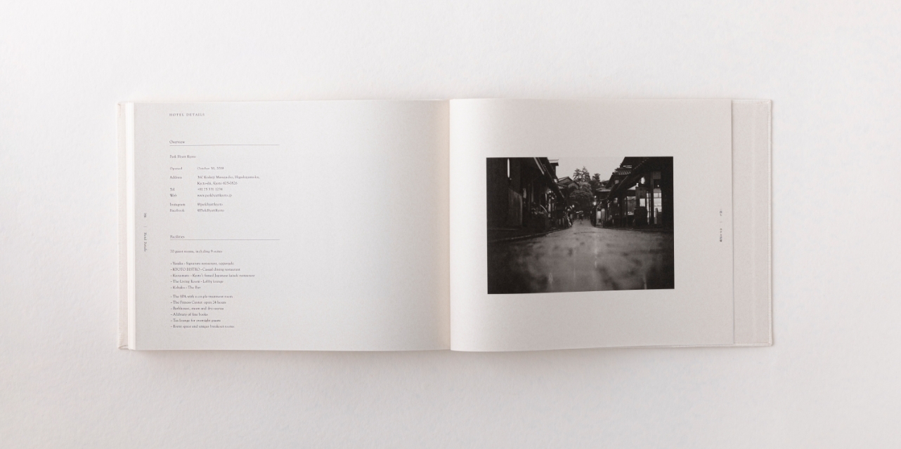 レイアウトは日本のミニマルな美意識をインスピレーション源とし、シンプルで緊張感のあるタイポグラフィと豊かな文脈を含んだ余白で構成されている。 製本には日本の伝統的な技術(和綴じ)を採用し、職人による手作業で一つ一つ綴じられている。和綴じは糊を使用しないため耐久性が高く、環境負荷も低い。また開きもよく、客室やラウンジでの長期間の展示にも適している。見た目やたたずまいの美しさと機能性の双方を兼ね備えた技術といえる。 隅々まで日本の美意識を行き渡らせ、パーク ハイアット 京都の歩みとその未来を祝福するのにふさわしい本に仕上げた。ホテルの客室や世界中のパーク ハイアットホテルのライブラリーやラウンジにも設置される予定である。
