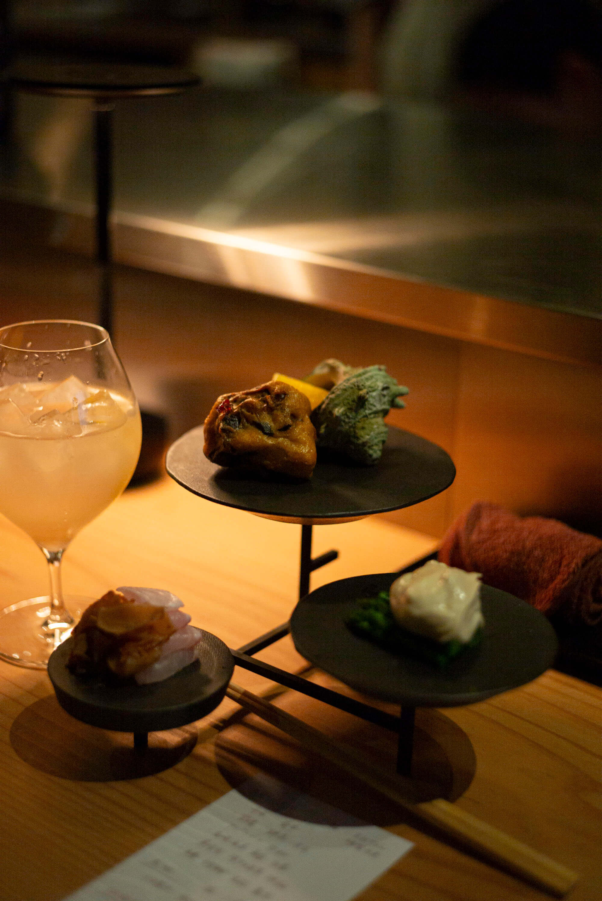寺内ユミさんデザインの鉄製スタンドMISHINAと3枚の器が持つリズム、器に合わせた美しい飾りつけ、食材を手際よく扱う様子に見入ってしまいます。さらに、料理ごとに語られる素材の話や調理の工夫など、豊富な知識を直接聞けたのも贅沢な体験でした。真衣さんの気さくな雰囲気もあり、料理を待つ時間も楽しく、リラックスした気持ちで味わうことができました。