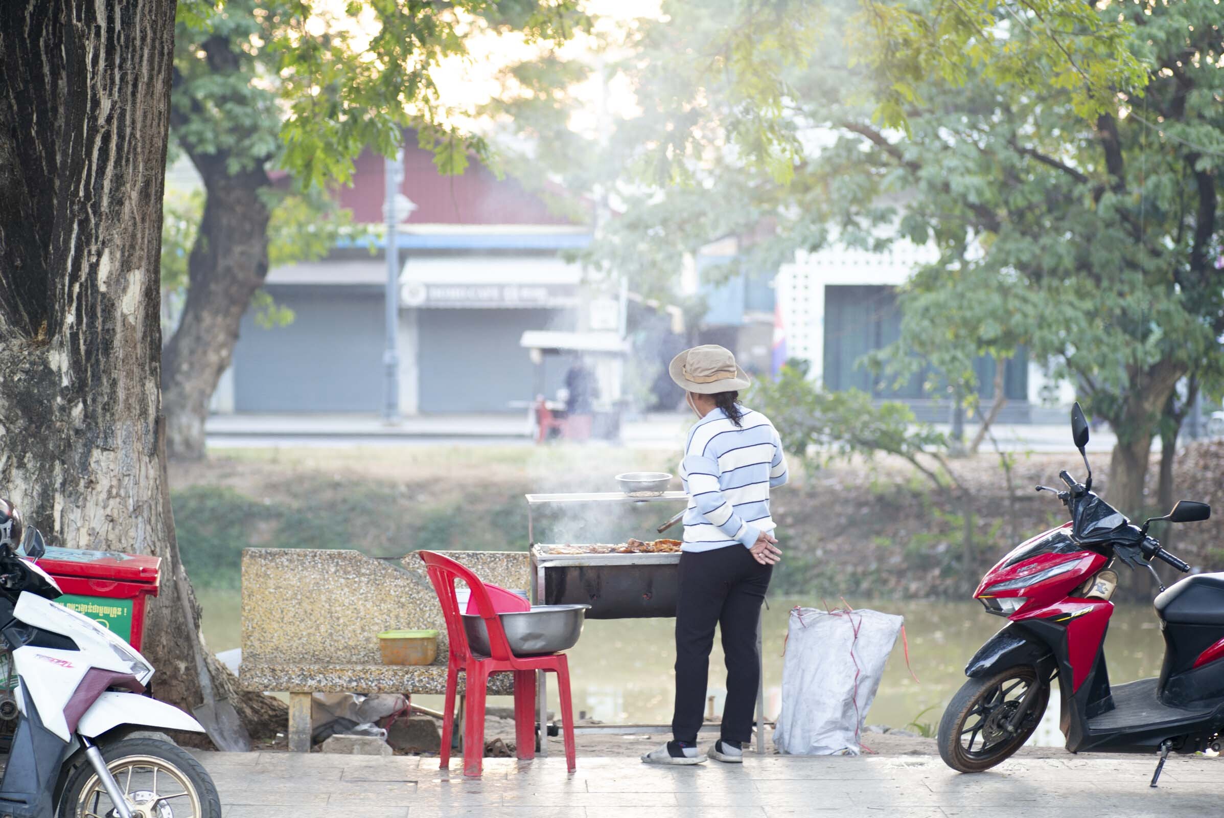 シェムリアップ川沿いをふらふらしていると少しずつ屋台が出始め、小学校(寺院)が始まりました。