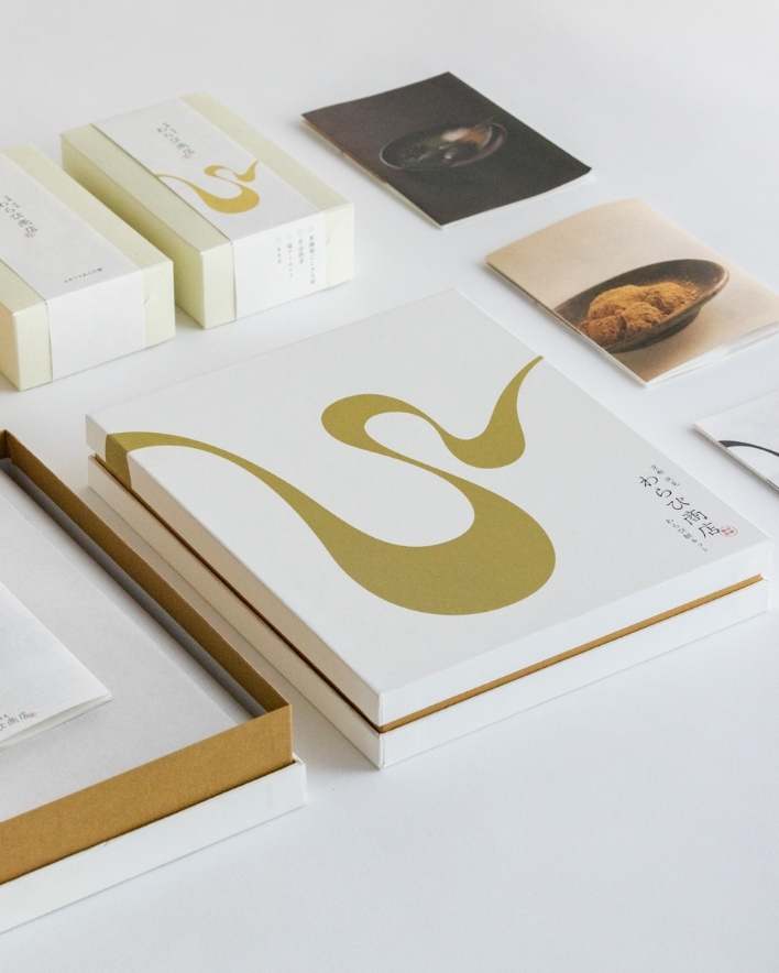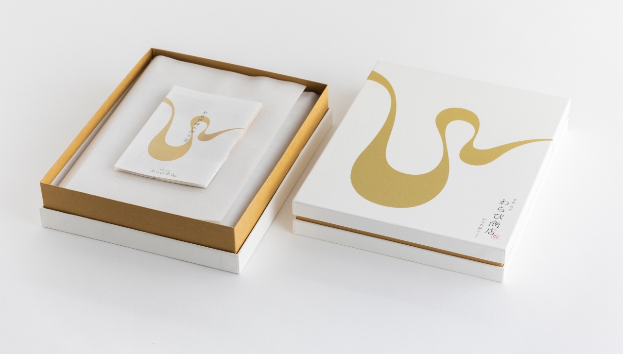 わらび商店のわらび餅はとても柔らかい口溶けが特徴的で、その特徴を、わらびのイニシャルWをぐにゃりとまげることで表現しました。