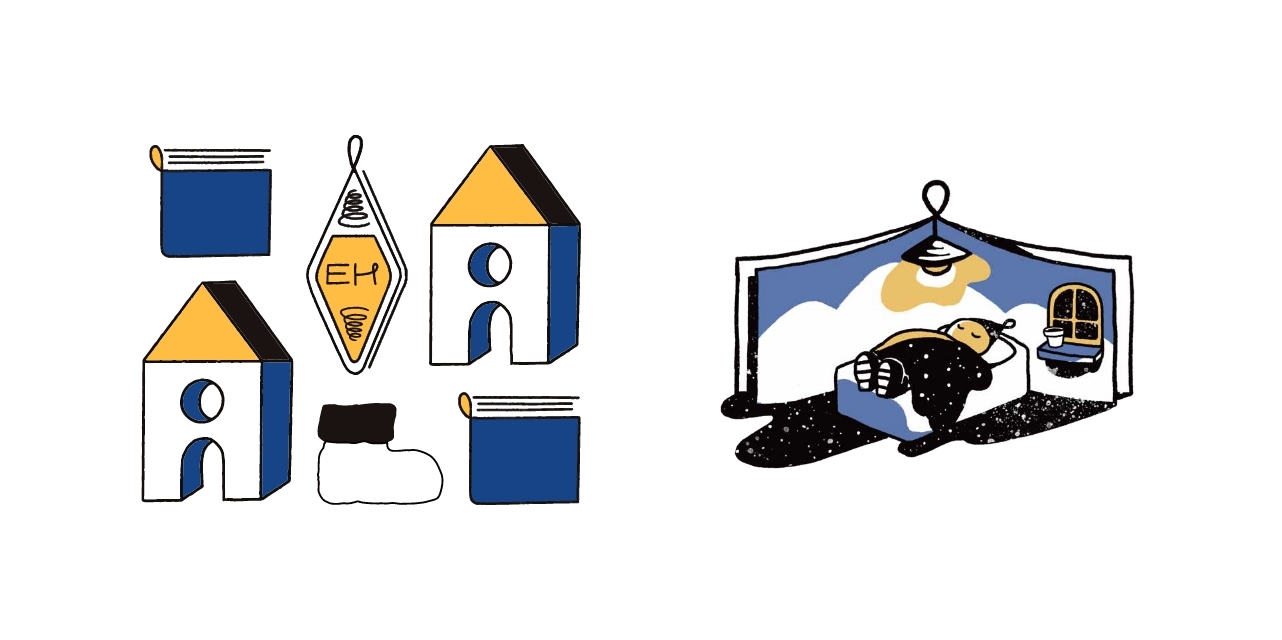 絵本の世界からリアルな世界に飛び出してきたイメージを家形のモチーフで、楽しくてわくわくする世界観をデザインしました。