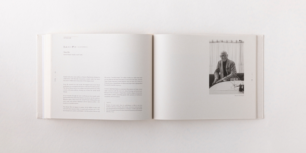 「Stories」の章では 設計を担当した竹中工務店 原田哲夫氏、インテリアデザイナーのトニー・チー氏、作庭家の北山安夫氏などパーク ハイアット 京都を作り上げてきた専門家のインタビューを掲載。美しいビジュアルブックとしてだけではなく、彼らの哲学やビジョン、ホテルの建設プロジェクトのバックストーリーを深く知ることのできる読み物としても楽しめるようにした。