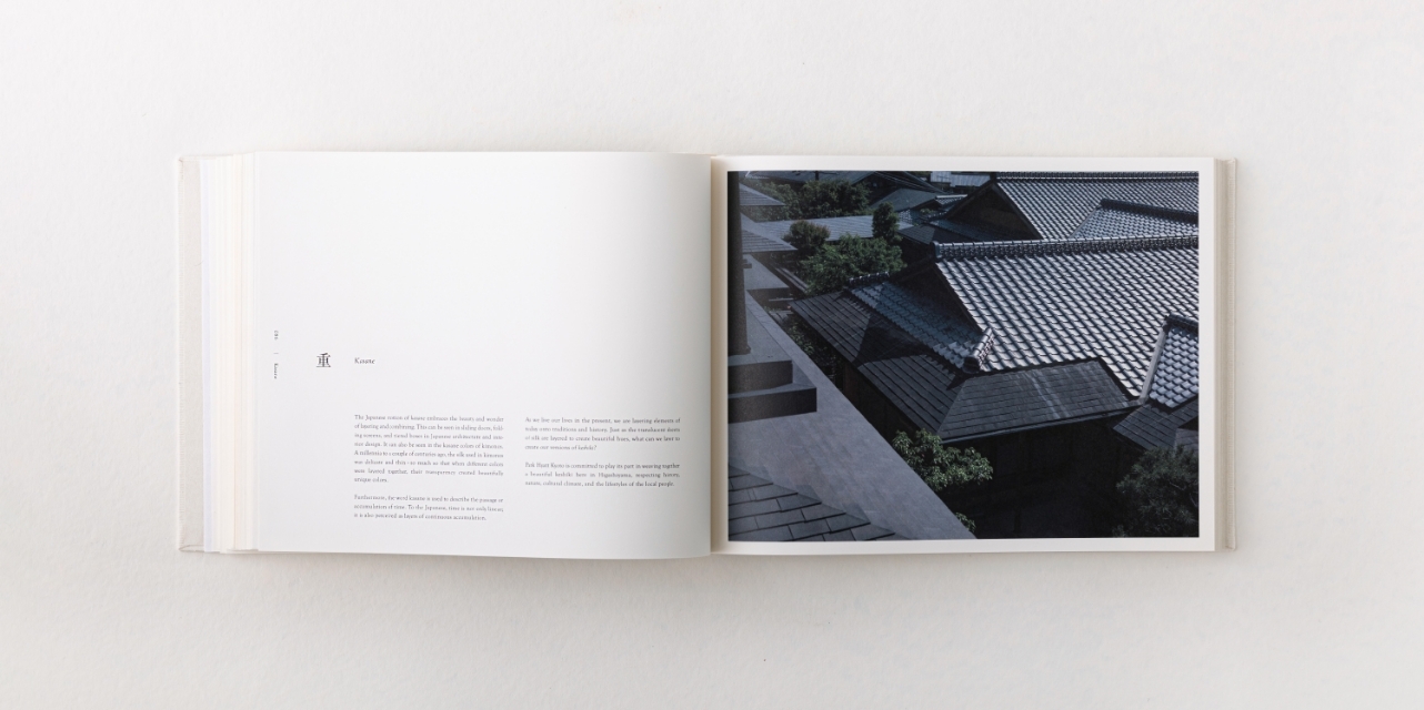「Park Hyatt Kyoto Story Book」はその解を探り、まだ京都やホテルに訪れたことのないユーザーにもその魅力を伝えるべく、またホテル開業5周年を記念しこの本は製作された。目の肥えた旅行者が思わず手に取りたくなるような、パーク ハイアットブランドらしい格調高さと、京都ならではの美意識やクラフツマンシップを兼ね備えた本である必要があった。